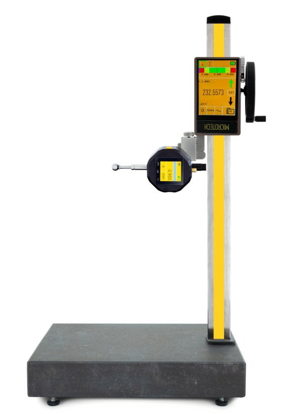 El medidor de altura de tabletas MICROTECH 2D es móvil con rueda de ajuste fino y tiene indicador de submicras en el 2º eje.