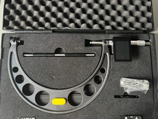 All micrometers complete with calibration protocol, manual, magnetic charging cable and plastic box.